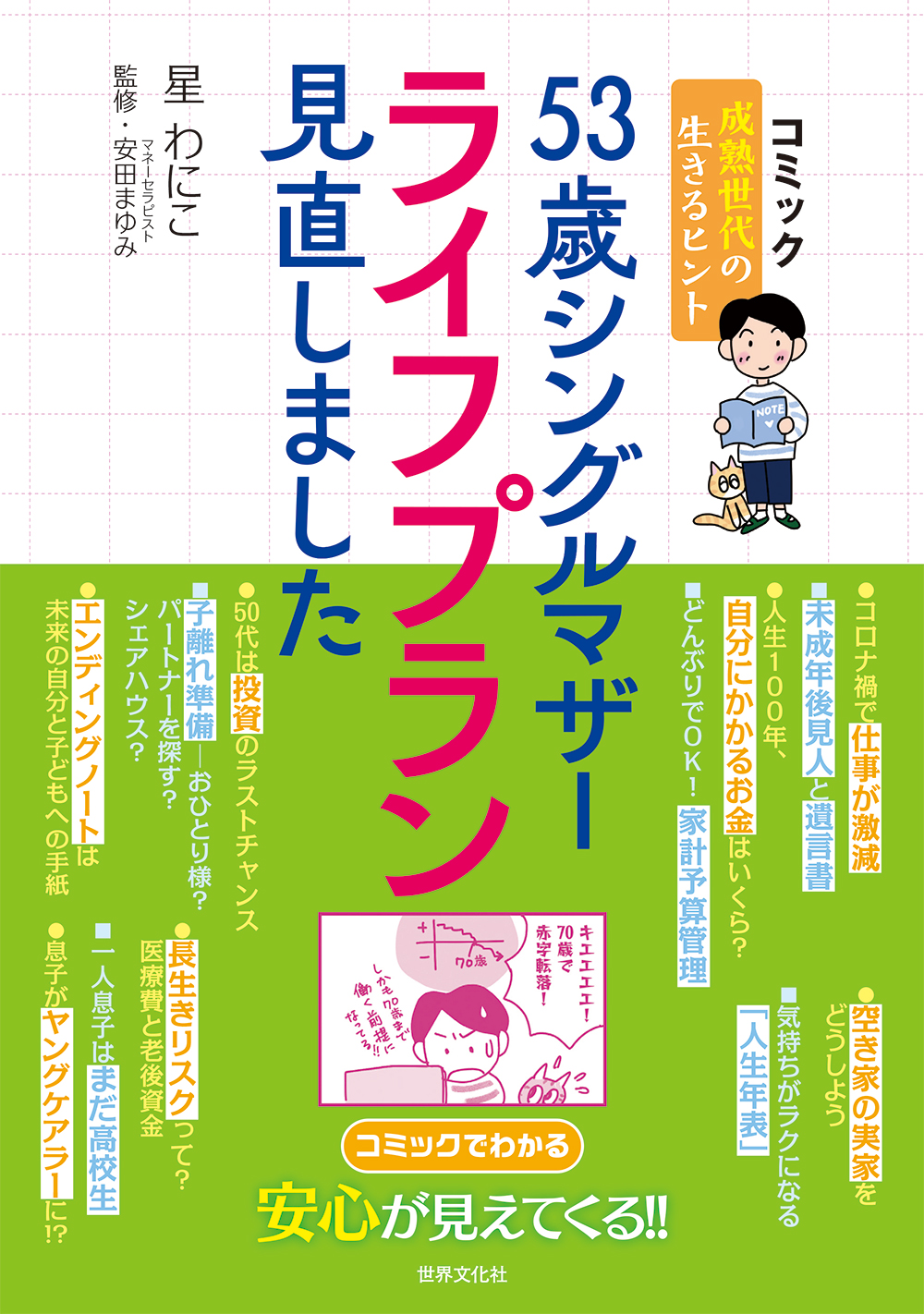 書籍 『53歳シングルマザー ライフプラン見直しました』世界文化社 星わにこ著 監修:安田まゆみ 2023年2月22日発売 コロナで仕事も体調も不安。子供のためにエンディングノートを書こう!とプロに相談したら「まずはライフプランから」と言われ? 老後の課題に向き合ってみた体験コミックです。よ... 書籍